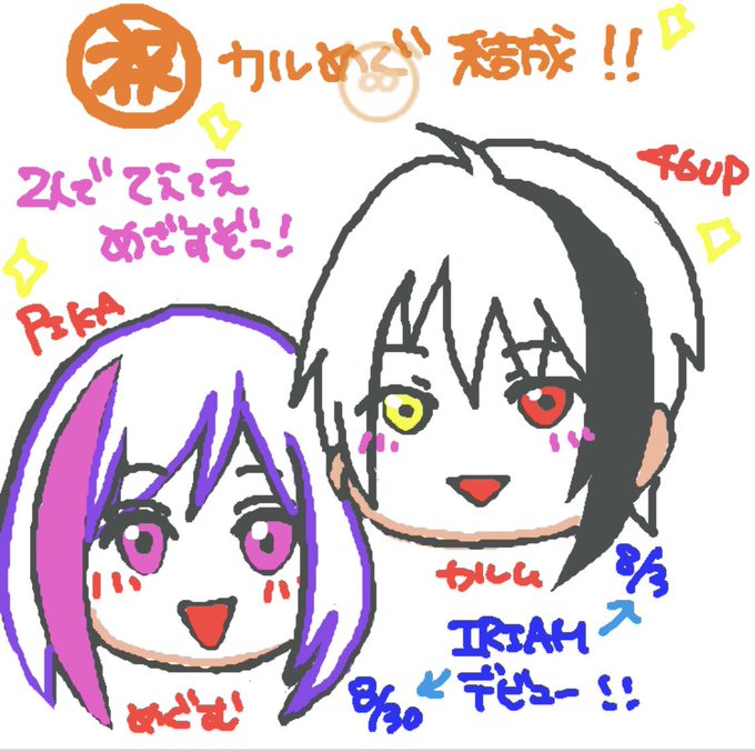 事務所違っても仲良し(✌'ω' ✌) そんな2人がコンビ結成しました。 何かやるかどうかは未定ですが、TwitterもIRIAMも盛り上げて2人で、てぇてぇ目指します٩( ‘ω’ )و ※萌は立ち絵まだなのでアイコンの仮の姿です。 #カルめぐ @sirakamikarumun くん #しらカルチャー @soueiMegumu_u #めぐあーと