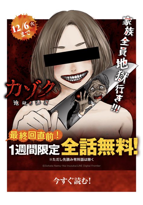 ただ今、最終回直前キャンペーン中! なんと!12/6まで、 46話無料になってます! 是非是非、この機会にお読みください! #LINEマンガ #ホラー漫画 #カゾク 地獄の連鎖 manga.line.me/product/period… twitter.com/souhata2013/st…