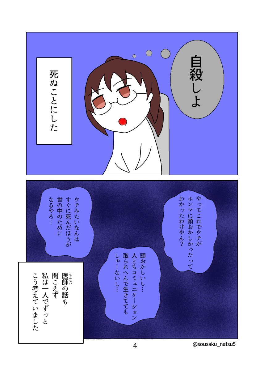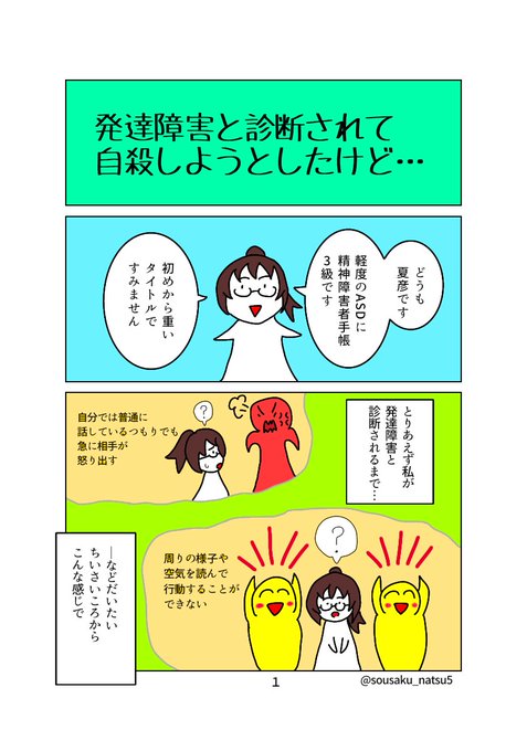 4 10 『発達障害と診断されて自殺しようとしたけど…』1/2 #漫画が読めるハッシュタグ #発達障害 #ASD #ホメバコ #漫画家志望 22/09/18 12:34