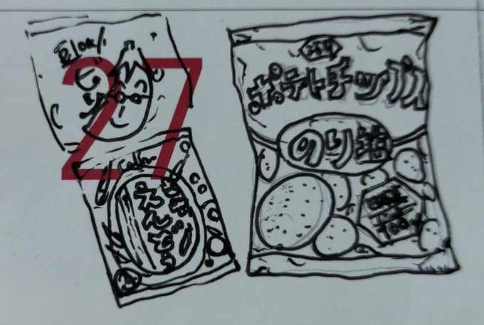 27.スナック うちの第1位は「湖池屋のり塩」 なぜなら義母がくれるから。旦那さんがのり塩好きなんだろう。私はのりが手について煩わしいので結婚するまで買ったことなかった。ベルマーク付なのも良い。ビーノやえんどう豆は最近ハマった #inktober2022 #kuretake_inktober2022 #インクトーバー