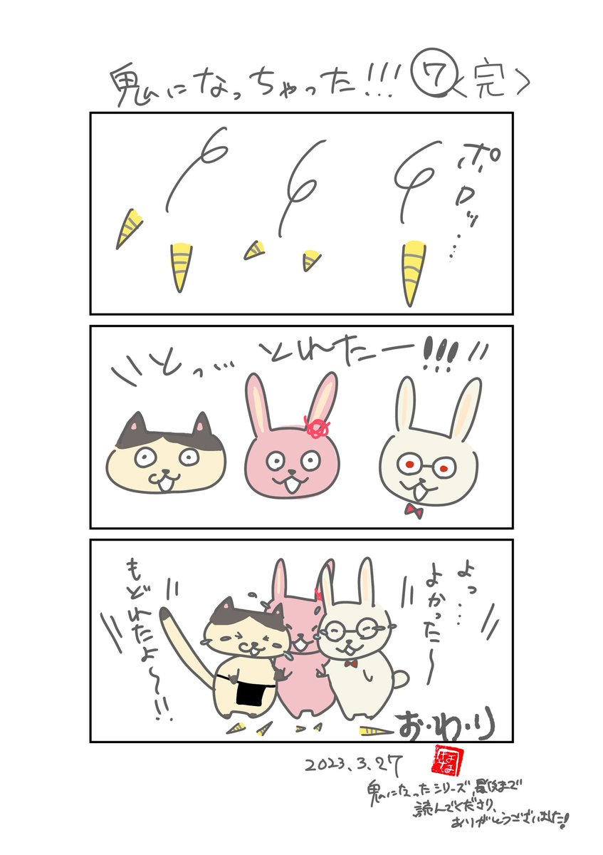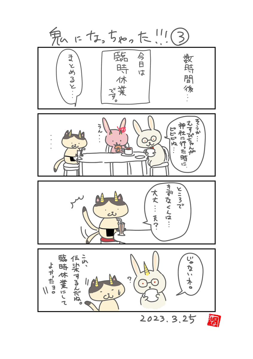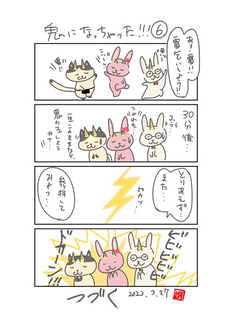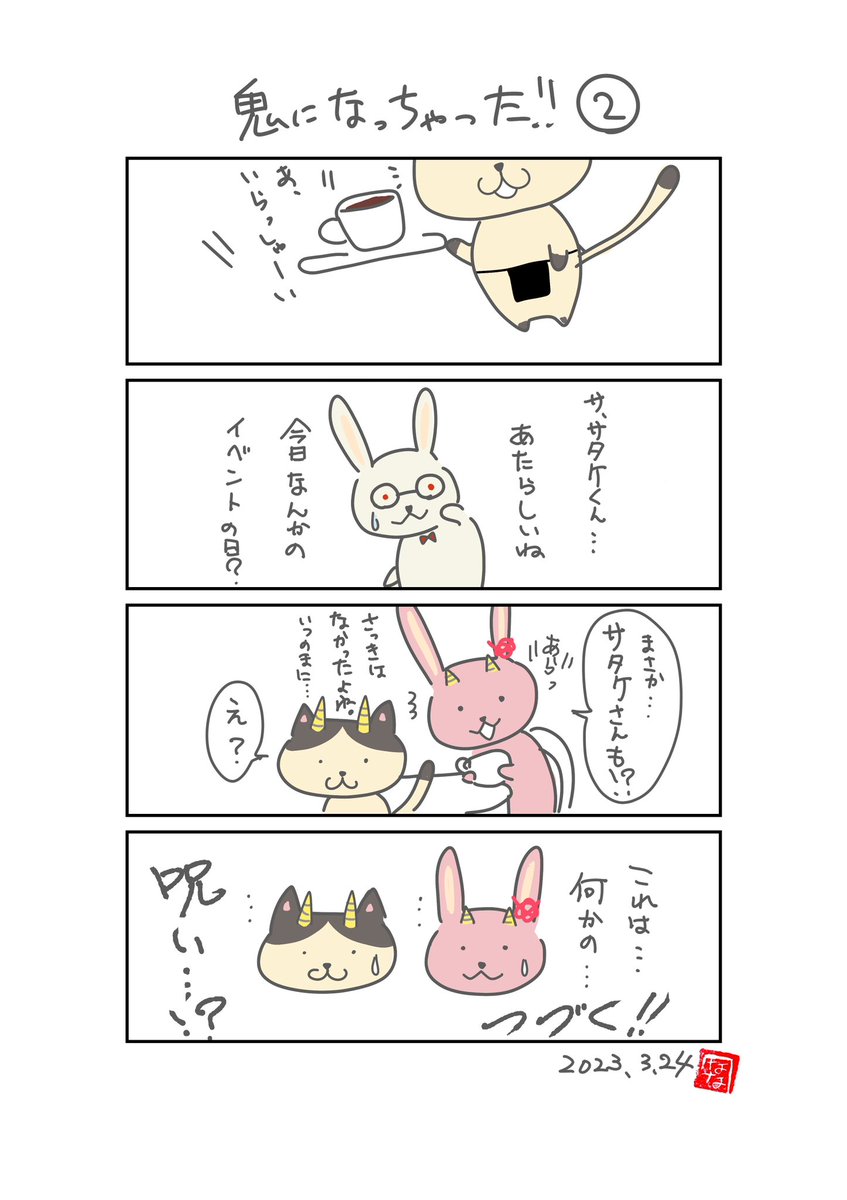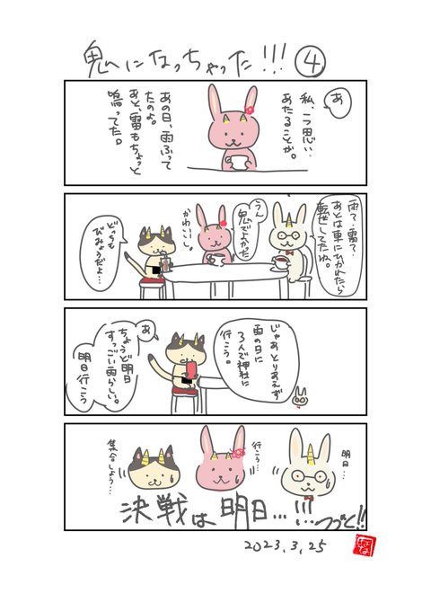#漫画が読めるハッシュタグ #4コマ漫画 #イラスト 【特別企画】👹 鬼になっちゃった!!!⑤ 私事ですが… 夜に寝た次男を布団に置いたら… ぎっくり腰になっちゃった!!! 湿布が手放せないっ‼️