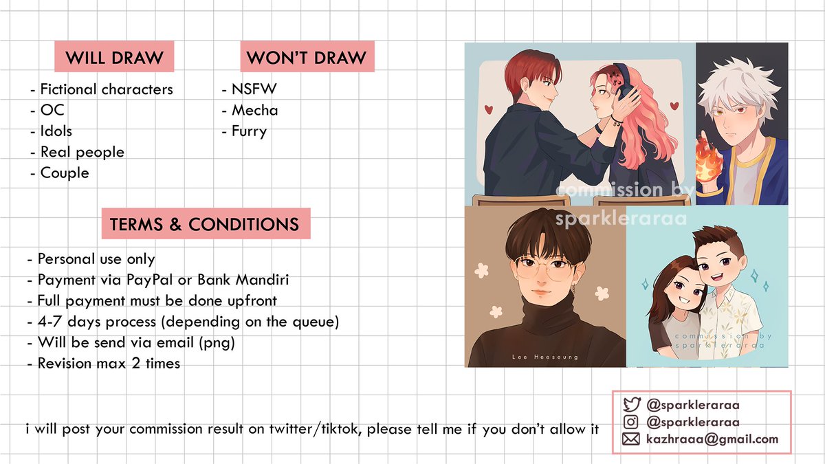 ✨ RTs/Likes are super appreciated ✨ Hi! I'm open for commission (local and international). The pricelist is still the same as last year! Limited slot. DM if you're interested 🙌 Other samples check here: 🌸 sparkleraraa.carrd.co 🌸 #commissionsopen #opencommissions