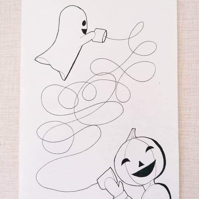 I get enemies to best friends vibes #inktober2021 #inktober #tick #illustration #enemiestobestfriends #enemiestobesties #art #artist #oc #ghost #pumpkinperson #illustrationart #ArtistOnTwitter