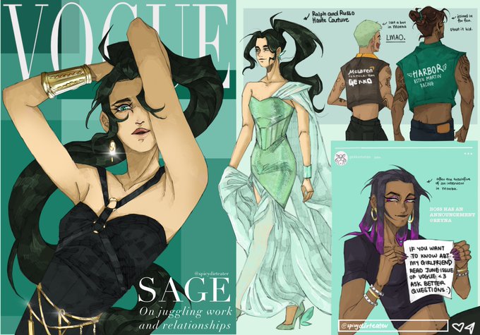 more of my valoxf1 au, but this time, its #Sage on Vogue, #Reyna pushing the #Reyge agenda and Gekko and Harbor just strutting it. #VALORANT #ValorantArt #VALORANTfanart