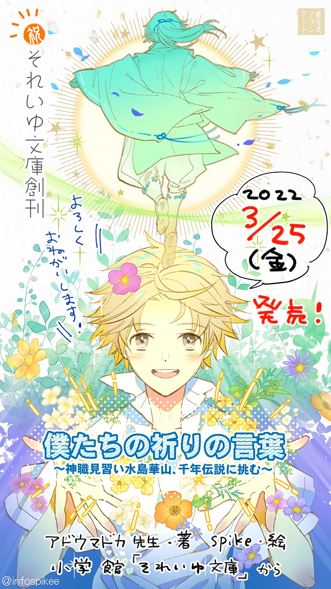 お知らせです📚 ㊗️3/25発売🎉明日! 新創刊されました、それいゆ文庫 から アドウマドカ先生著 『僕たちの祈りの言葉〜神職見習い水島華山、千年伝説に挑む〜』 カバーイラストを担当させていただきました。 お祝いファンアートも描きました🌸☺️ 🥳よろしくお願いいたします🙇 shogakukan.co.jp/digital/09D102…
