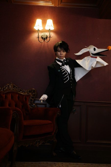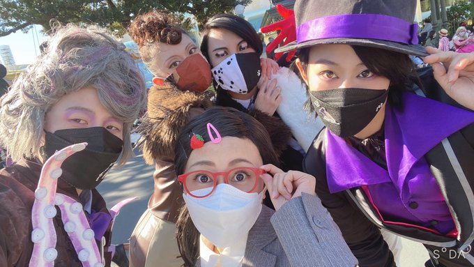 【手下仮装】 お分かり頂けただろうか…紫組とスキャターの背後で何が起こっているか…そう、スカーに抱き着かれているダルメシアの目が死んでいるのだ…w 🐙&📸:@torata37 😈:@omoteno_urize 👓:@xxshin9xx 🐱:@d_len_min #Dハロ仮装2022 #Dハロ2022 #手下仮装