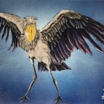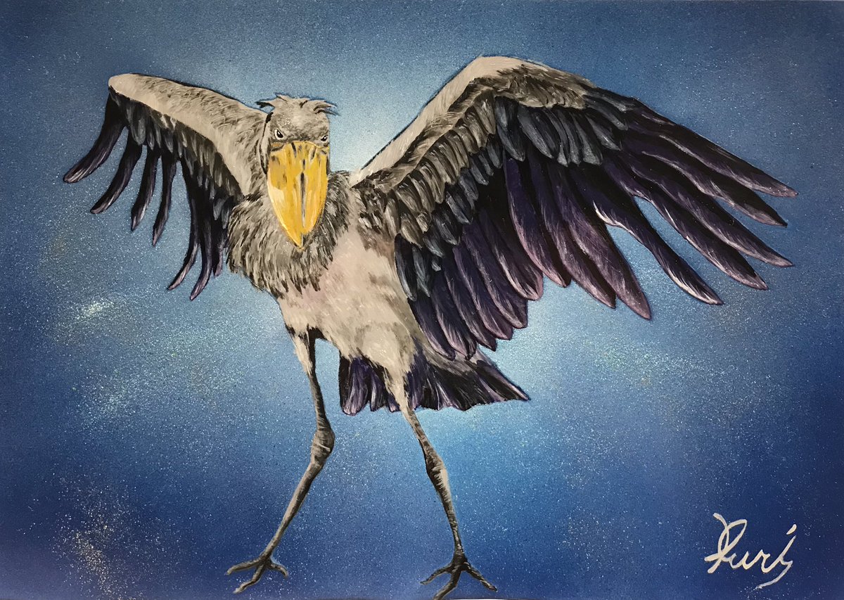 不動の鳥「ハシビロコウ」 『あにまるわーるど動物展~part6~』に展示されてます‼️ 翼の部分を紫色にして、色違いにしました。さらに、ラメ粉を使ったので、キラキラして見えます 凛々しい姿を生で見てほしい‼️ #aaagallery #スプレーアート #絵描きさんと繫がりたい #ハシビロコウ #鳥 #絵画