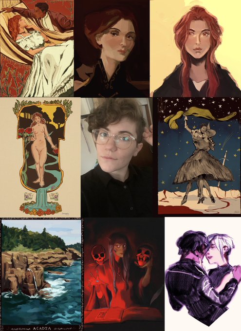 heya #PortfolioDay! ⭐️ my name's kate - i'm a hobby artist. i like to illustrate art nouveau but make it lesbian and original characters