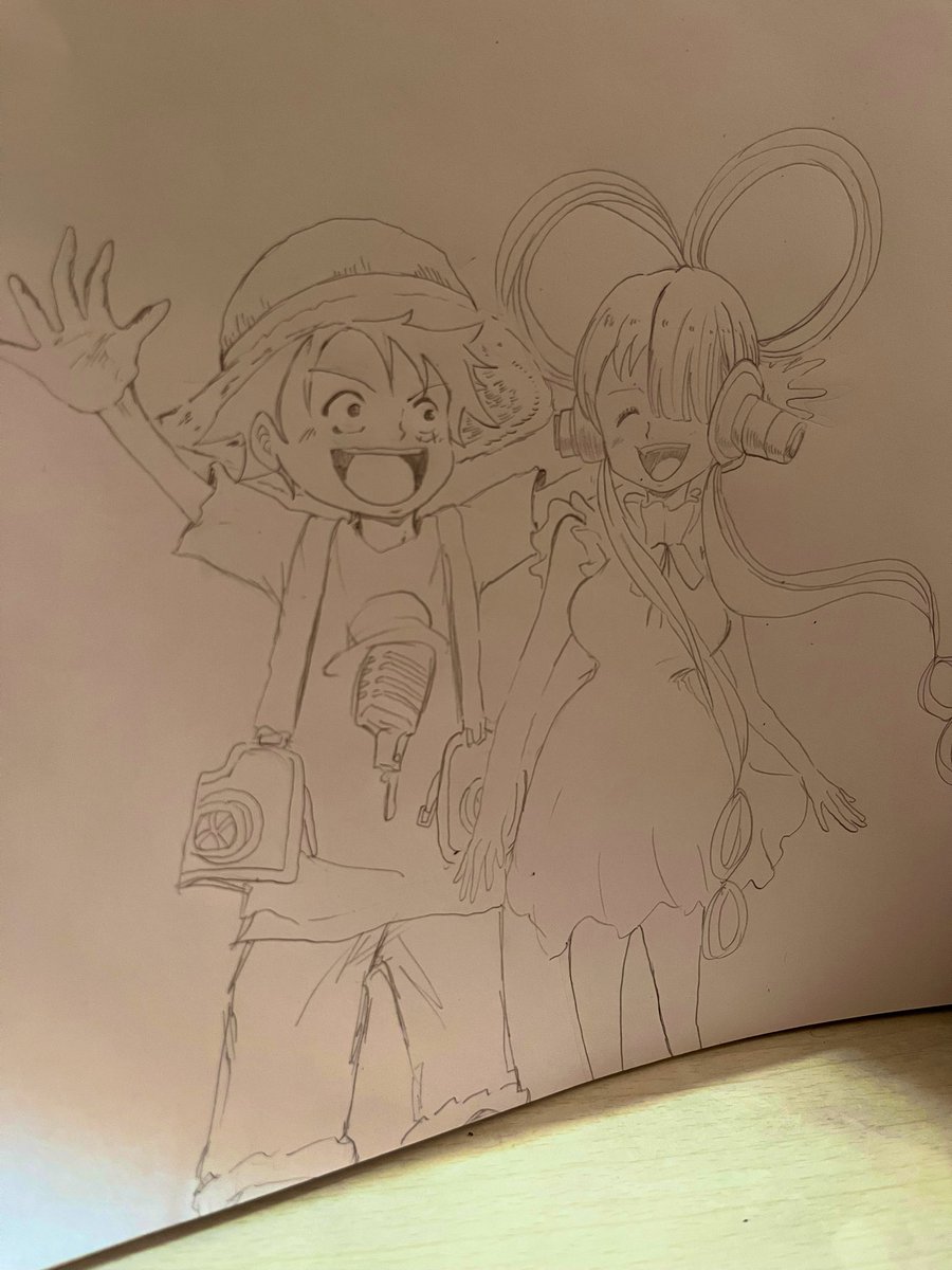 映画楽しみすぎて ワクワクしながら 描いた!ルフィとウタちゃん💕 シャンクスの娘でルフィの幼なじみとか 最強すぎるよウタちゃん😍💕 映画で仲良くおしゃべりしてたら キュンっってなりそう……( ´͈ ᵕ `͈ )♡ ……これ後で色塗りしたいな~♪ #ワンピース #ワンピースフィルムRED #イラスト