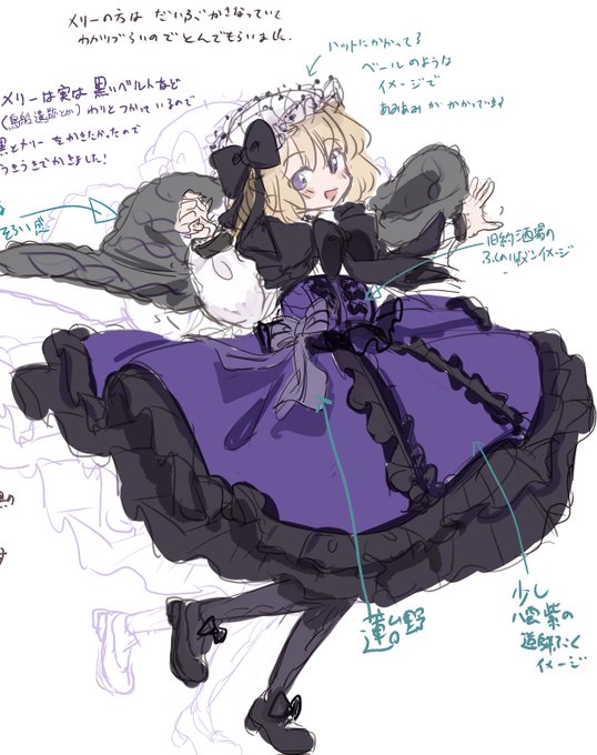 こちらの 例大祭こ17abで頒布の 【東方×和服&ゴスロリ・ロリータイラスト合同誌】「幻想少女クローゼット」に参加させていただいています。 こちらはあとがきにかいた衣装案のメリーの方。秘封描いています。 twitter.com/MizukuraMk2/st…
