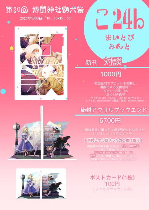 秘封アクリル本立て 通販ページを開けました! 二人の秘封倶楽部の間に本をはさんで「文脈」を作って遊ぶことのできるものです。 イベント受け取り6,700円/宅急便は6,950円になります! 【春例大祭/秋の京都合同】の受取⇒ miners.booth.pm/items/4580325 【宅急便】による配送⇒ miners.booth.pm/items/4572463