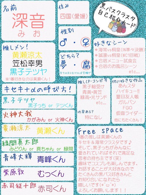 のんびり活動してます(о´∀`о) 色々お話出来る方と繋がれたら嬉しいな〜と思っています♪ (他にはあんスタ、夏目友人帳などもやってます) いいね&RT両方、気になった方へご挨拶に伺います! #黒バスクラスタさんと繋がりたい #黒バスレイヤーさんと繋がりたい #レイヤーさんと繋がりたい