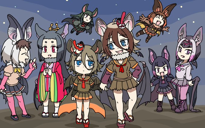 お題2つ ・ニヤニヤしているテングコウモリ ・新旧デザインのテングコウモリ。新デザが親、旧デザが子供っぽい感じ。 ついでにリデザコウモリ詰め合わせ 親子感は少し足りない気がする