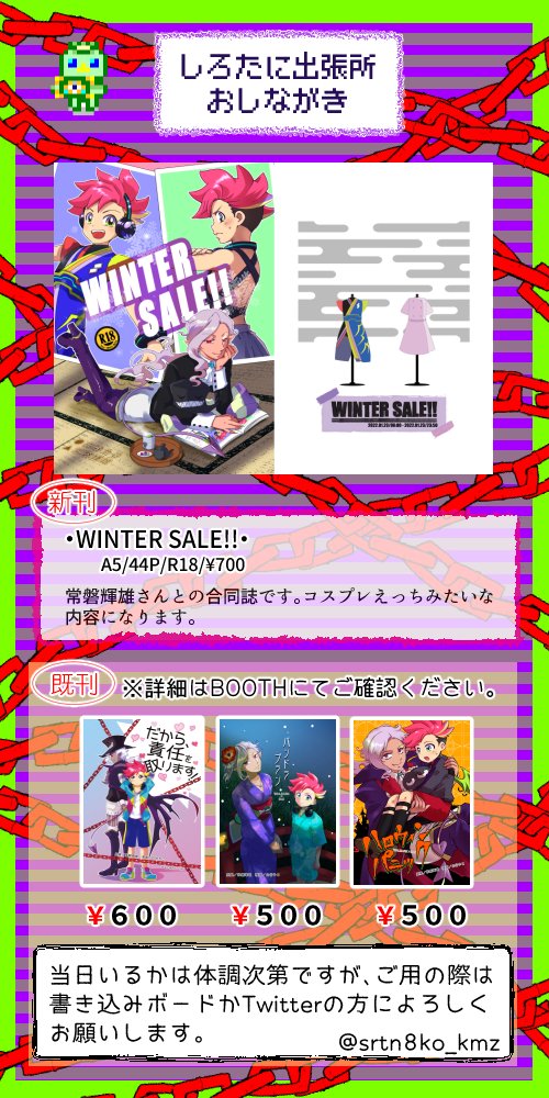 1月23日のお品書き | 白谷やこ #pixiv pixiv.net/artworks/95692… ピクスクのお品書きと概ね一緒ですが 当日はゆるゆるよろしくお願いします。 #KAMIZBEAT饗祭