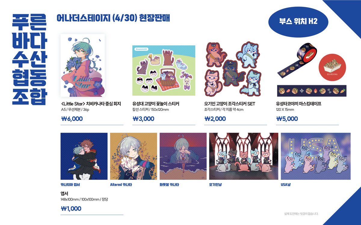 (RT💙) 4/30 어나스테 인포입니다. 부스 위치: >1관 H2< "푸른바다수산협동조합" 모든 굿즈 소량으로 가져갑니다! 타래로 위탁 및 나눔 굿즈 공지합니다!