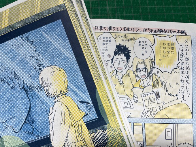 5 15 本のおまけペーパーこんな感じのものになります〜。本編に1mmくらいしか関係ないゆるい感じの内容です。 1枚目印刷サンプル、2枚目おまけ漫画冒頭一コマ、3・4枚目は各漫画のオチコマです。表面は落書き笹川兄妹ぴくちゃ〜にしました 22/03/18 22:59