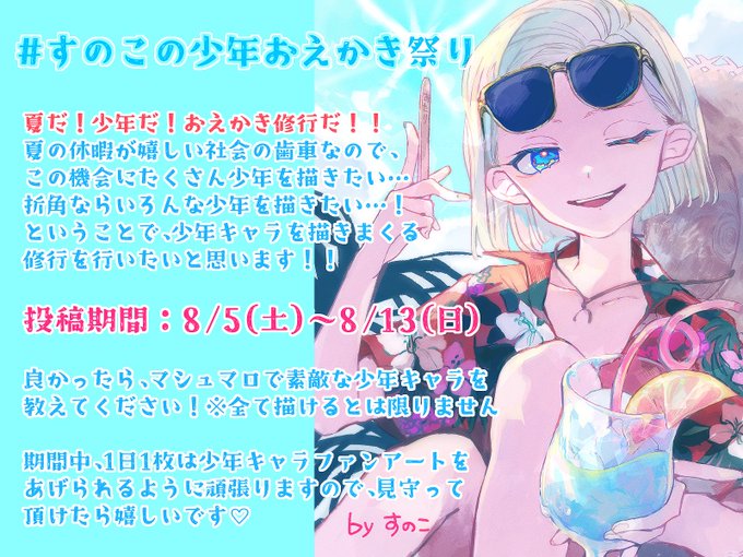 #すのこの少年おえかき祭り 勝手にフェスティバります🏮👘✨ いつも通り、気の向くままに描きまくるだけなのですが……この期間はとくに集中的に描きまくって少年具現化力(?)を高めたいなと思っておりますので、応援していただけるとさらにやる気もりもりです!宜しくお願い致します!
