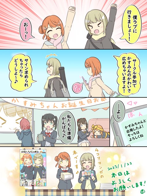 64 170 僕ラブ36新刊の表紙とサンプルです! 虹ヶ咲4コマ漫画のまとめ本です🙏 ツイッターにアップしてきたものと今回用に描いたもの合わせて約70本収録してます!🌈🌈 23/01/11 20:12