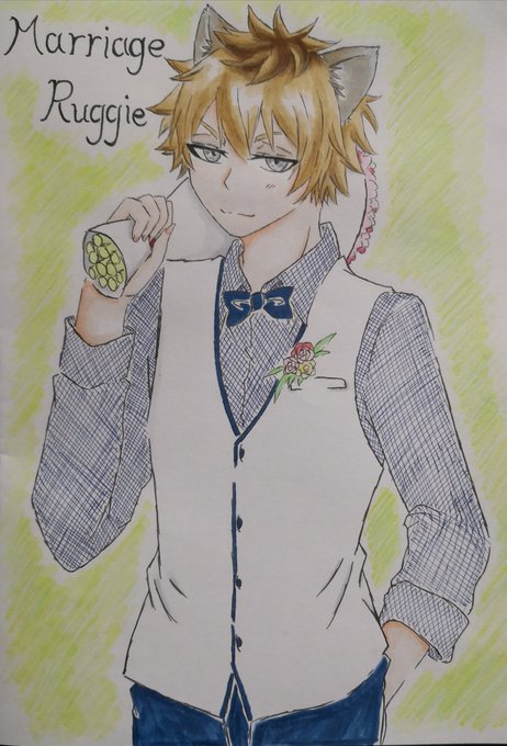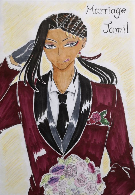 そしてさらに今更だけど、マリッジジャミルさん!! ジャミルさんは白もよかったけど、やはり赤の正装、絶対似合うと思って。 肌がちょっと失敗した気がする…💦 ブーケめちゃ難しかった…← #ツイステファンアート