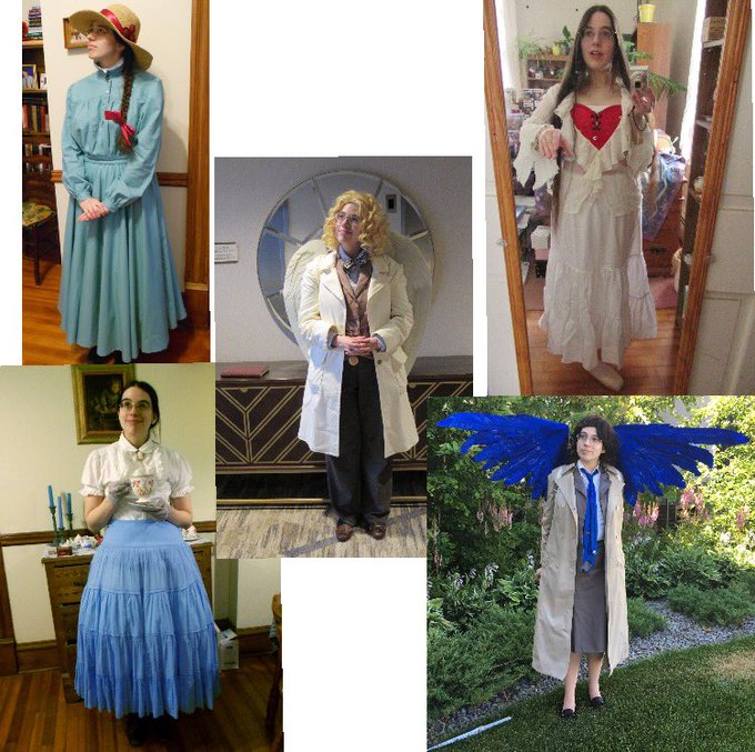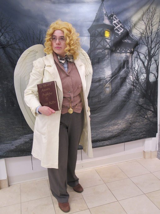 "I don't like this place. It feels *spooky*." #GoodOmens My entry for @theineffablecon 's #GoodOmens30#cosplay contest! (Thanks to those who voted for me!) 💖😇📚☕️ (Taken at @t2comiccon 2019) @GoodOmensPrime @neilhimself {wig by @ardawigs, custom wings by @thepinkpoudo}