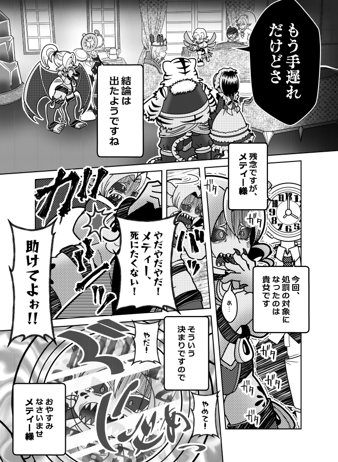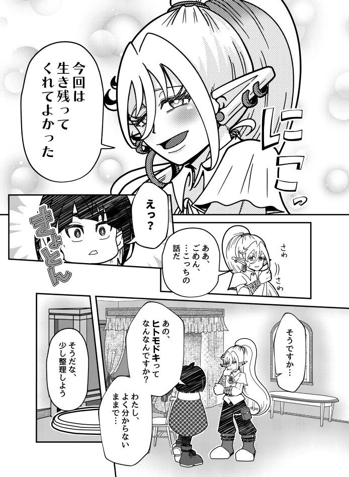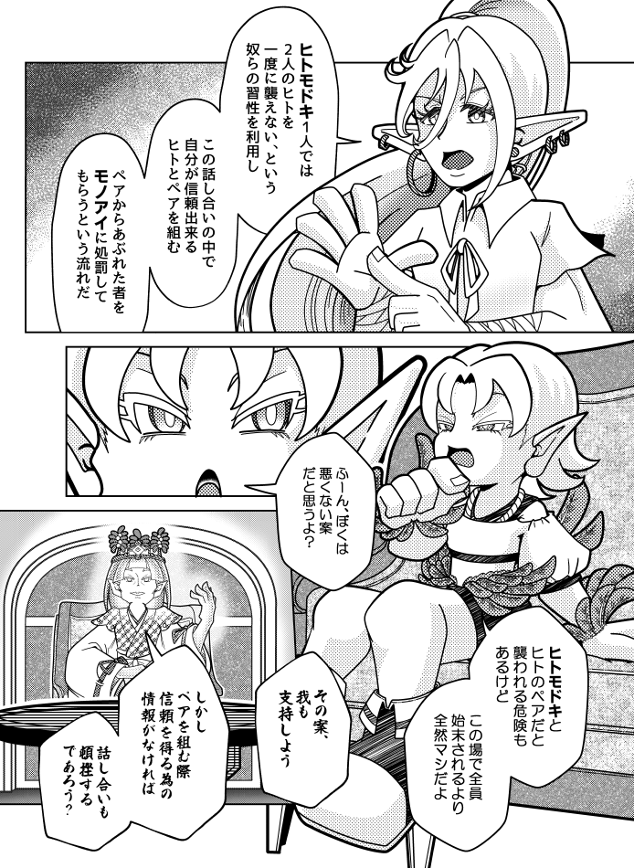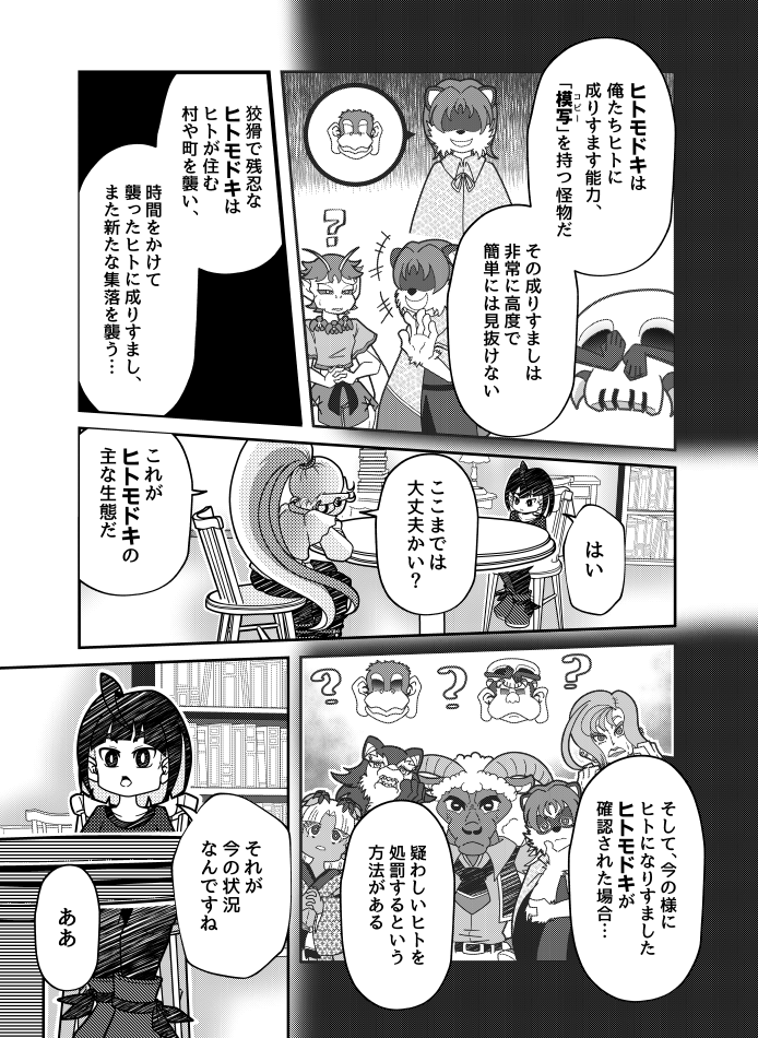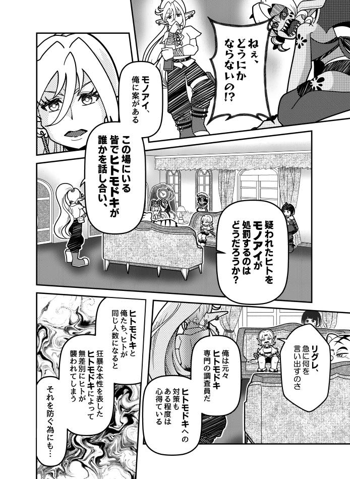 #異種族人狼ヒトモドキ #漫画が読めるハッシュタグ ファンタジー×異種族×人狼ゲーム×??? 第一夜~ヒトモドキ騒動、開幕②(3/3) ※1話2/2再掲です 2話は9月頃(きおココ3回分更新後こっちの作業開始)予定だけど、早く続きが見たいって言われたら8月頃(きおココ次回分更新後に作業開始)にします
