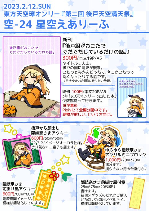 【お知らせ】 2月12日の天オンリー「第二回 後戸天空満天祭」 お品書きです。 以下ツリーにグッズの実物見本を載せておきます。 (過去に載せたものは過去ツイ引用しておきます) それでは何卒よろしくお願い申し上げます。
