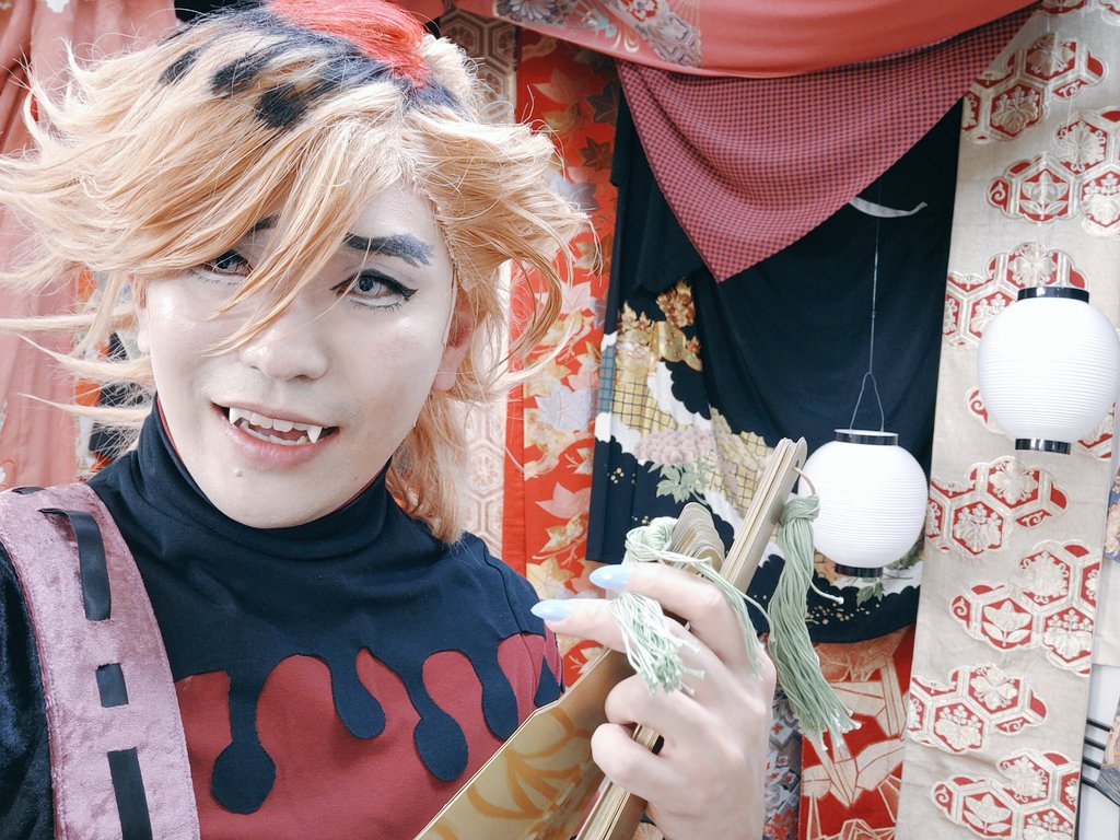 毎度のほぼぶっつけ本番メイクで後悔してるが…。今回も次回に繋がる試作出しとしては満足😃✨ カラコンとかレインボー良いのが無いから加工表現してみるか…🤔 #アコスタ池袋 #童磨コスプレ #原作の隣に自分のコスを貼る