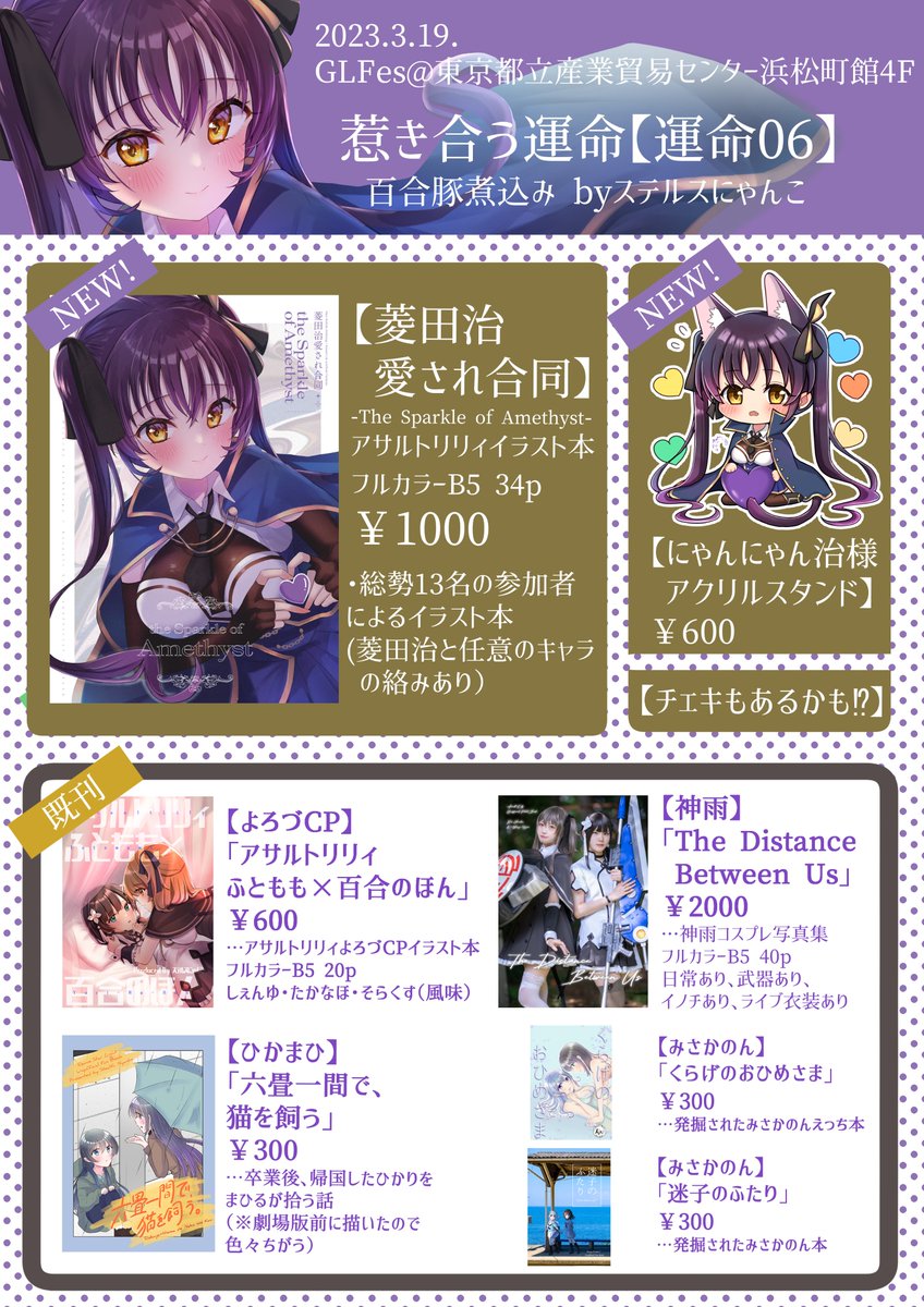 💜おしながき💜 3/19(日)開催 #惹き合う運命9th 【運命06 百合豚煮込み】のお品書きです! 菱田治(@stealthnyancos)と今村紫(@kanono13)が売り子します!(※着替えのため開始直後はいない可能性があります) す先生(@sconbuoishi)と合同スペースをお願いしております!! twitter.com/stealth_nyanko…