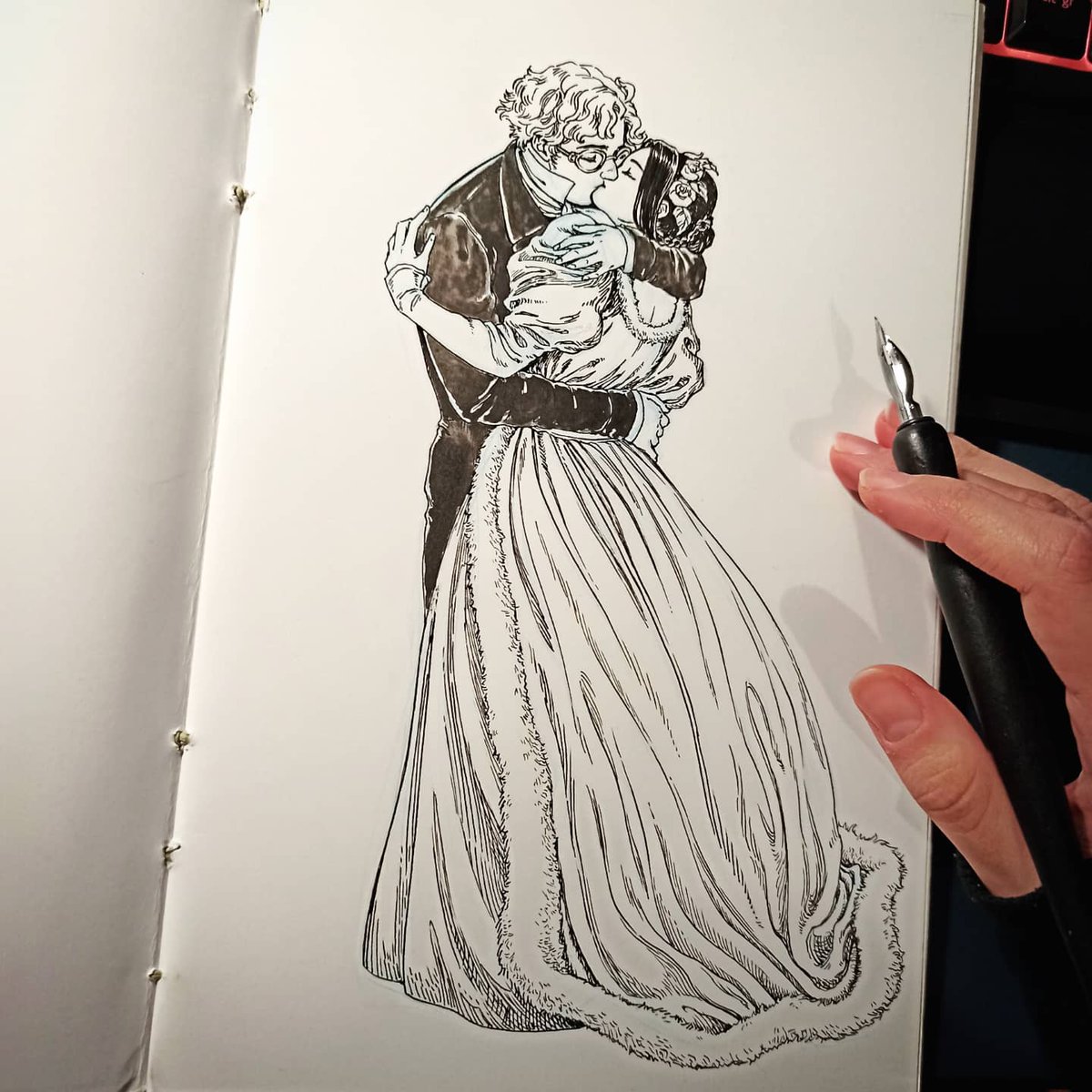 Happy new year everyone! First #drawing of 2022 'The Kiss' done with ink. What are your goals for the New Year? . #artistsontwitter #traditionalart