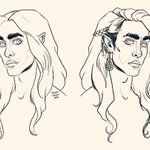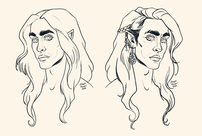 Cleaned up digital lines for Aurie. Left shows his 20s - 30s. Right side is his 40s- 60s (current). A rare moment when his hair isn't full of leaves. And yes... he's meant to be looking through you lol. #art #dndart #DnDcharacter #bard #artistsontwitter #halfelf #Aurie