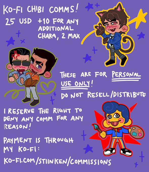 hellooo i'm opening chibi c*mmissions! I have 5 slots open right now, more info linked below on my ko-fi. please send me a message if you have any questions/concerns!