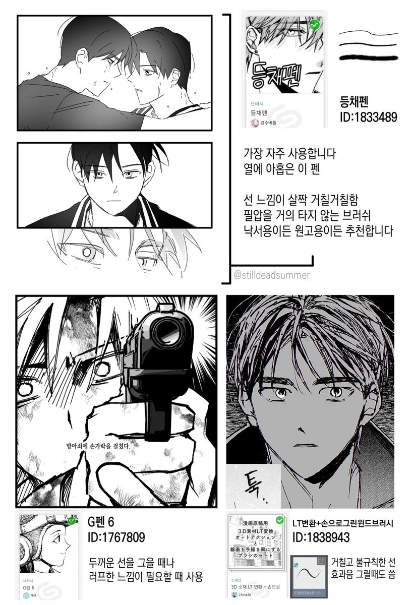 만화 그릴 때 사용하는 펜 정리했어요 전부 클튜 브러쉬 소재 입니다🥰 등채펜 : assets.clip-studio.com/ko-kr/detail?i… G펜 6 : assets.clip-studio.com/ko-kr/detail?i… 윈드브러시 : assets.clip-studio.com/ko-kr/detail?i… twitter.com/stilldeadsumme…