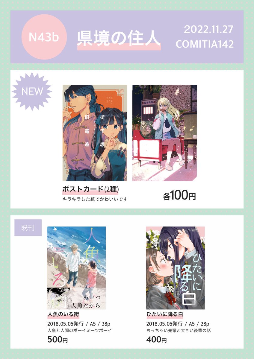 7 14 新しいのはポストカードです 既刊2つ持っていきます #コミティア142 #コミティアお品書き 22/11/26 21:21