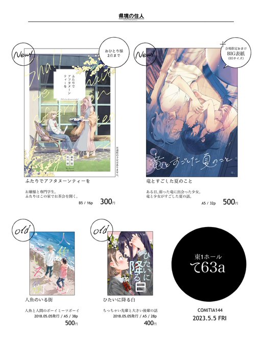 19 41 来週5/5(金)東京ビッグサイトにて開催のコミティア144に参加します! 新刊2種と既刊2種を頒布予定です🌷 #COMITIA144 #コミティア144 #コミティア144お品書き 23/04/28 22:03