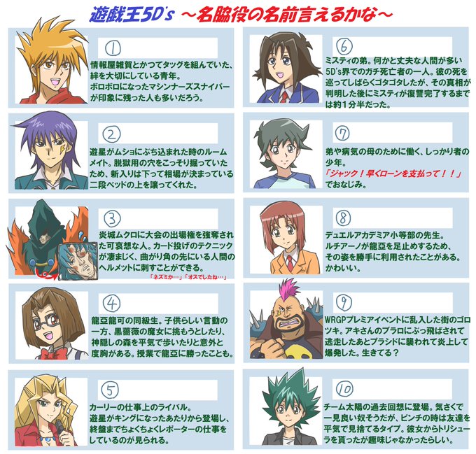 気まぐれで5D'sの脇役キャラクイズ作ってみました。 解答はリプ欄に貼ります。時間あったらやってみてね。 選出基準 ・作中で名前を呼ばれたことがある ・デュエル当番回がない