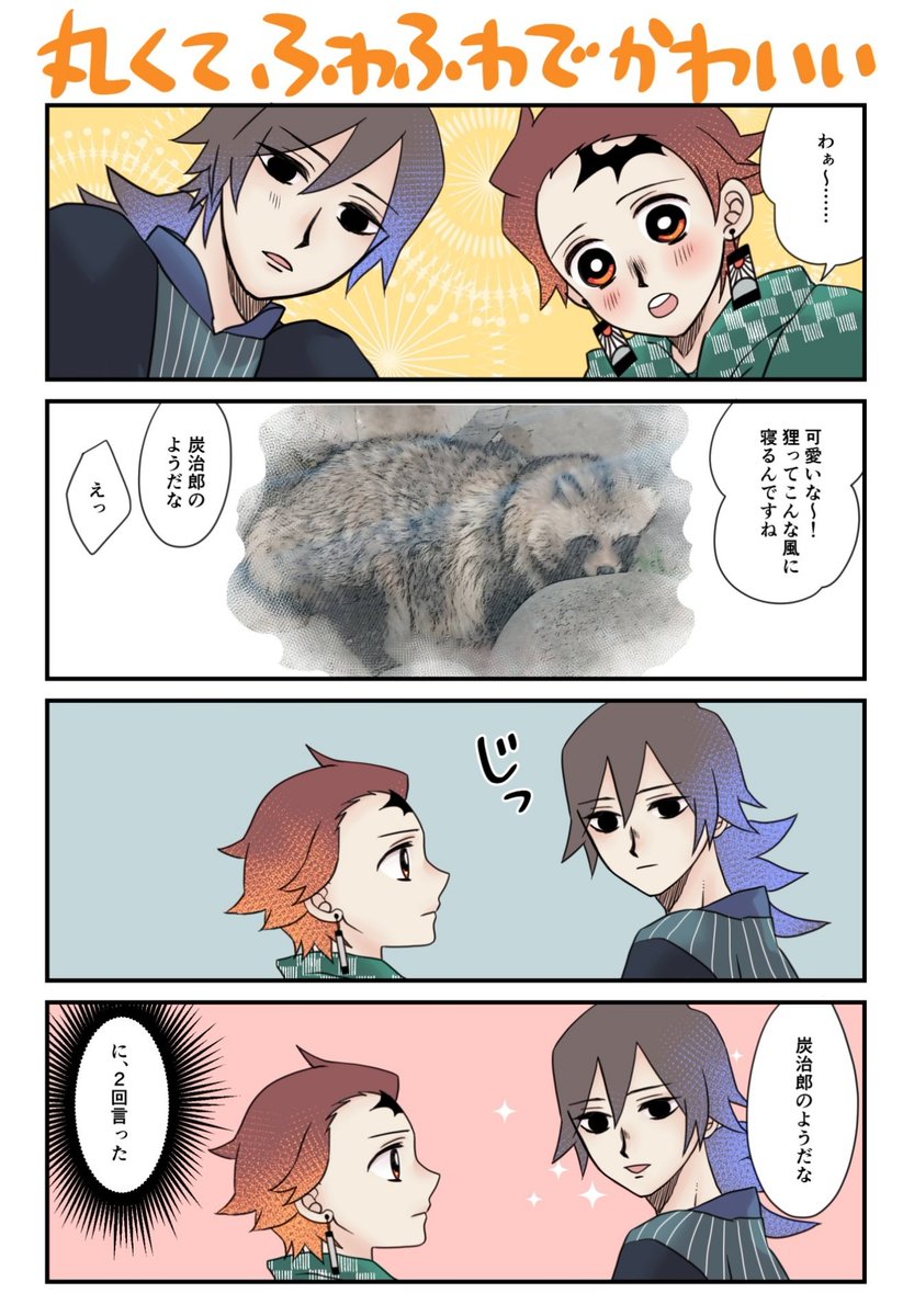【義炭】地元の公園に久しぶりに行ったらたぬきがおりましてすかさず脳内でぎゆたんに変換するわたくし😇 今描いてる原稿に入りきらなかったのでここにらくがきを… ぎゆさんは「まるくてふわふわであったかそうで」「とても可愛らしい」=「たんじろのようだ」と思ってるだけですいつものやつです😊