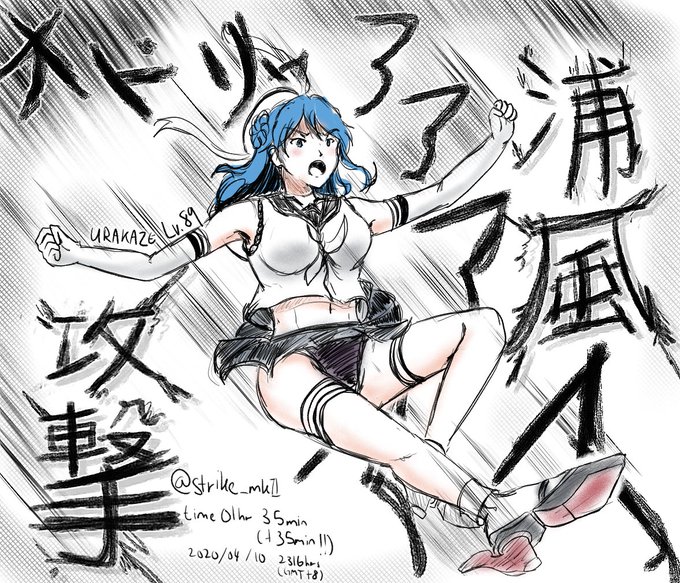 今夜はちょっとやりたかったポーズで決めるんだけどポーズのラフだけが30分掛かりました…(^▽^;) で、結果は何かを気合入れるの浦風じゃ。 …自分はね、手書き漢字がまだNGなのにどうしても書きたかった!! #艦これ版深夜の真剣お絵描き60分一本勝負 #艦これ版真剣お絵描き60分一本勝負_20200410