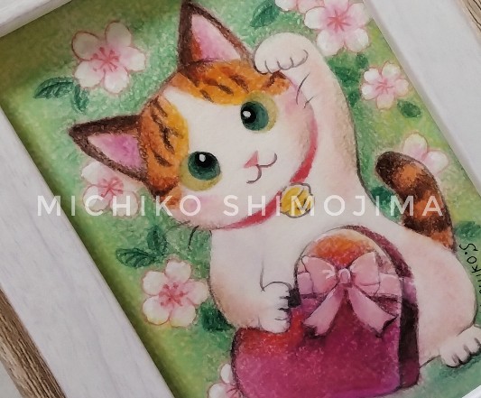 「ねこ展」銀座歌舞伎座 木挽町広場第4幕4日目!今日も元気にスタートします🎵今日は #さくらの日 🌸 桜の花を描いた作品をいろいろと出品しています😊 #猫 #絵 #イラスト #下島みちこ #木挽町広場 #銀座歌舞伎座 #桜