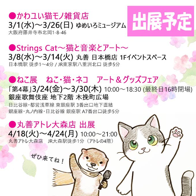 4 16 いよいよ明後日から🎵日本橋駅、東京駅からすぐ丸善さんの中です。ぜひ来てね🌸 ■Strings Cat ~猫と音楽とアート~ 3/8(水)~3/14(火) 9:30~20:30(最終日19時迄) #丸善日本橋店 1階 日本橋駅/JR東京駅八重洲北口 honto.jp/store/detail_1… #猫 #黒猫 #ミケ猫 #桜 #絵 #イラスト #下島みちこ 23/03/06 20:07