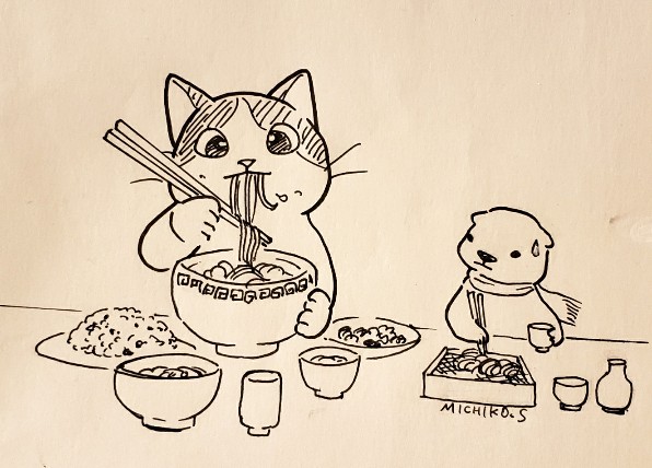 昨日の夜 : 2人は晩ご飯を食べに行きました。パンダの食欲に驚くうーちゃん👀 #猫 #絵 #イラスト #下島みちこ #猫専門またたび堂