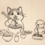 1 13 昨日の夜 : 2人は晩ご飯を食べに行きました。パンダの食欲に驚くうーちゃん👀 #猫 #絵 #イラスト #下島みちこ #猫専門またたび堂 23/05/28 07:28