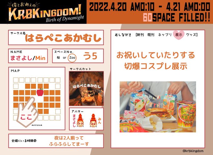 7 21 #キリバキBOD 素敵なテンプレお借りしました! 【ZOO🦏う5】 DKな切爆がハピバしているコス展示になります!皆さんとお祝いできるのとても楽しみです🤗✨ よろしくお願いいたします⚙💥💕 22/04/19 21:20