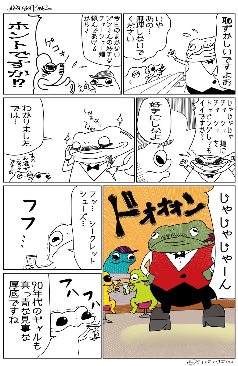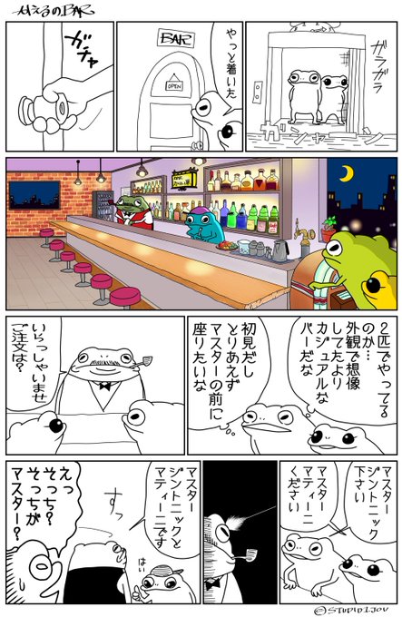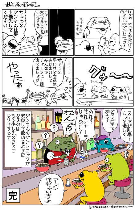 『かえるのバー おまけ⑤』 最終ページです。最後まで読んでいただいて本当にありがとうございましたm(_ _)m #漫画 #漫画が読めるハッシュタグ #漫画好きな人と繋がりたい #ゆるいイラスト #絵描きさんと繋がりたい #マンガが読めるハッシュタグ #創作漫画 #絵の世界 #ジントニック #ラーメン