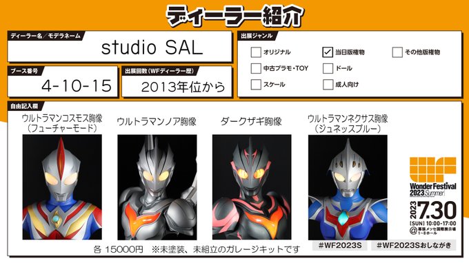 改めましてワンフェス2023冬おしながき ブース番号 4-08-05 【新作】 ウルトラマンノア胸像 【再販】 ウルトラマンネクサス胸像 【再販】 ダークザギ胸像 【再販】 ウルトラマンレジェンド胸像 お値段は各10,000円 未塗装未組立のガレージキットです #WF2023Wおしながき #WF2023W