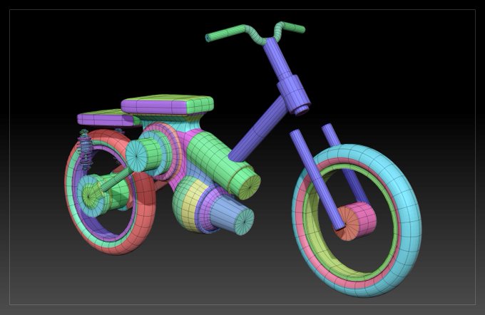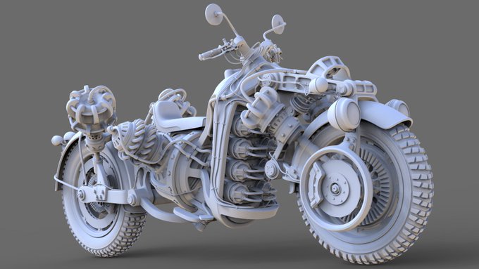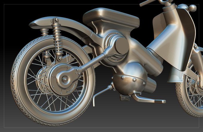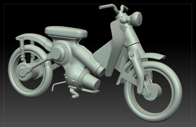 去年から作っているシリーズの小型バイクのモデリングがほぼ完成しました。今回はカブリスペクトです。#ZBrush #ZModeler