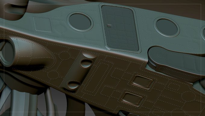 今までほとんどIMMブラシを使ったことがなかったのですが、今回リベット打ちに使いました。グループ境界に沿って配置できるのですごく便利ですね。もっといろいろ試してみます。#ZBrush