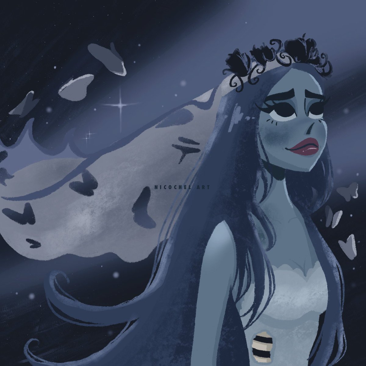 day 23 of #nicochelartober: corpse bride 💙🤍 this is officially my favorite piece ever and it was so much fun drawing emily 🦋 #inktober #artober #corpsebride #timburton