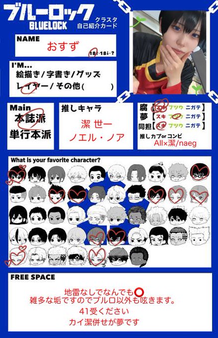 念願のタグします😭🏷𓈒𓏸︎︎︎︎ 自己紹介カード書くの夢でした⚽️♥️ ブルロの友達いっぱい欲しいです 苦手なものなどは無いです‼️‼️ 4️⃣1⃣右大好きですよろしくお願いします #ブルーロック好きな人と繋がりたい #ブルロレイヤーさんと繋がりたい #ブルーロック好きさんと繋がりたい