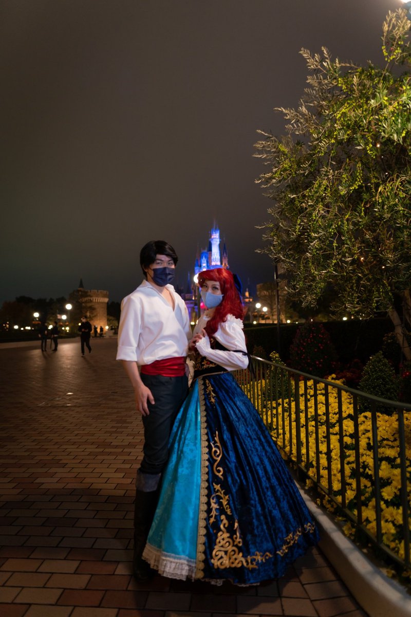 【#Dハロ仮装】 1日目の閉園間際、夜のお写真に四苦八苦💦すぅさんに出会ってご紹介頂き素敵に撮って頂きました💫お花も綺麗な場所でお城をバックに☺✨4枚目の何かに追われてる風なのは我らのあいほん📱限界😇 📷:@Bonaham_san さん エリック:戒にーさん #TheLittleMermaid #Dハロ #Dハロ仮装2021