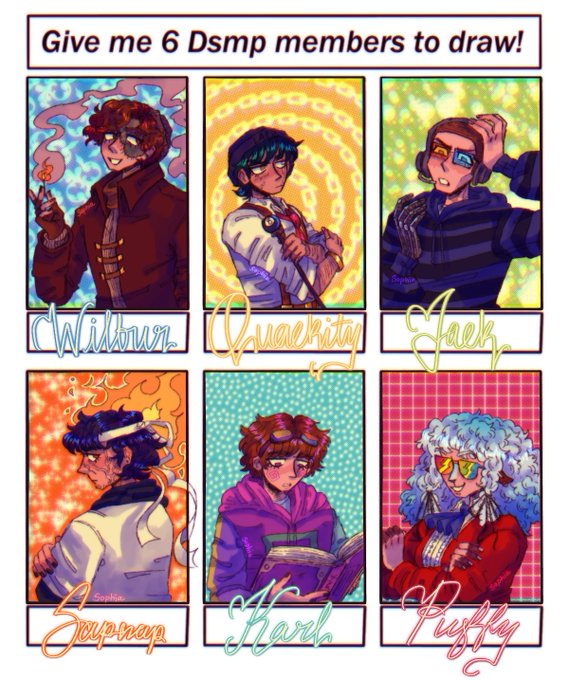 dsmp six fanarts thing!! i was going to do this in febuary but i kind of Forgot my bad #wilbursootfanart #quackityfanart #jackmanifoldfanart #sapnapfanart #karljacobsfanart #captainpuffyfanart